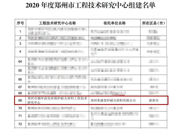 經河南省鄭州市科學技術局批準,在鄭州榮盛窯爐耐火材料有限公司成立循環(huán)流化床鍋爐耐火材料工程技術研究中心,該中心是繼神華集團和國神集團之后成立的CFB技術研發(fā)和耐材應用中心。